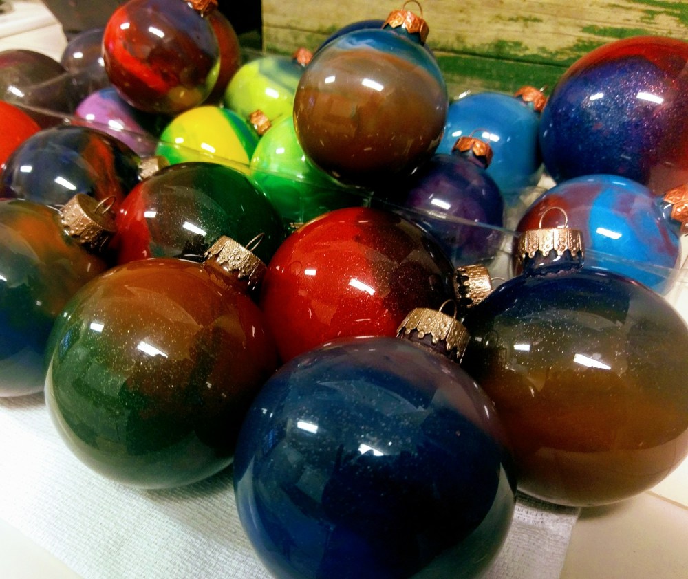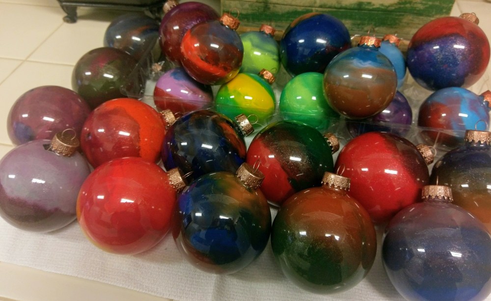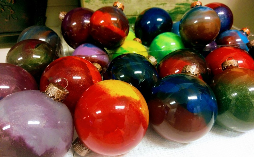 This was also a new project for me but a lot of fun. I started with clear glass ornaments and large box of Crayola crayons. I used a small hot air tool to melt the wax. Break colors in pieces about 1-2 inches and add any color into the glass ball. The wax melts fairly fast and I rotated the ornament until all the wax was melted and adhered to the glass.