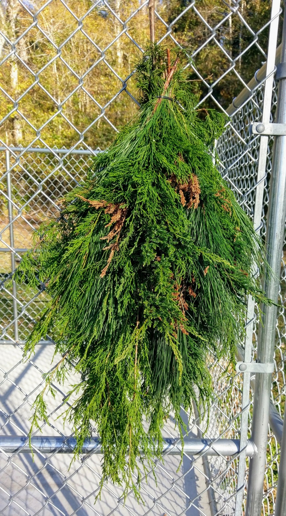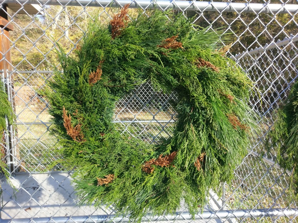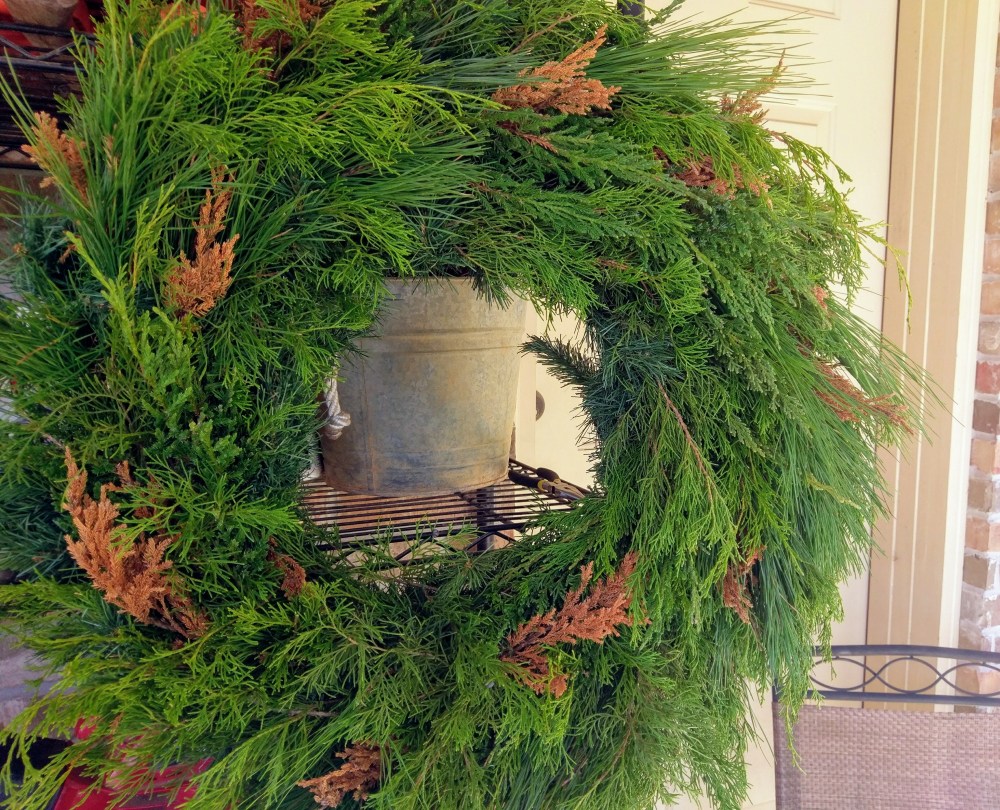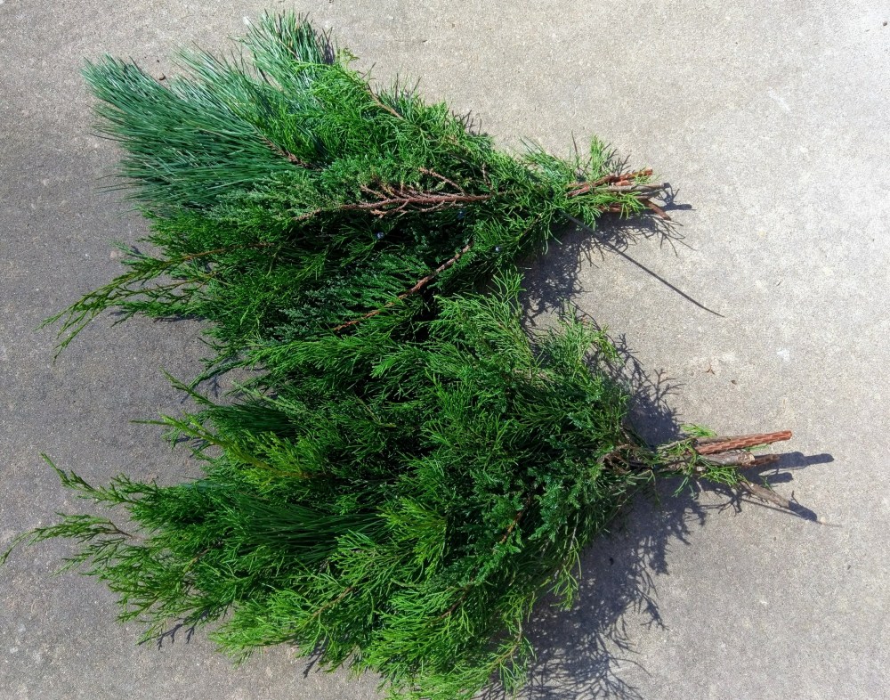 I began making the wreath by collecting various evergreens. I used cedar, juniper, and pine for the base.