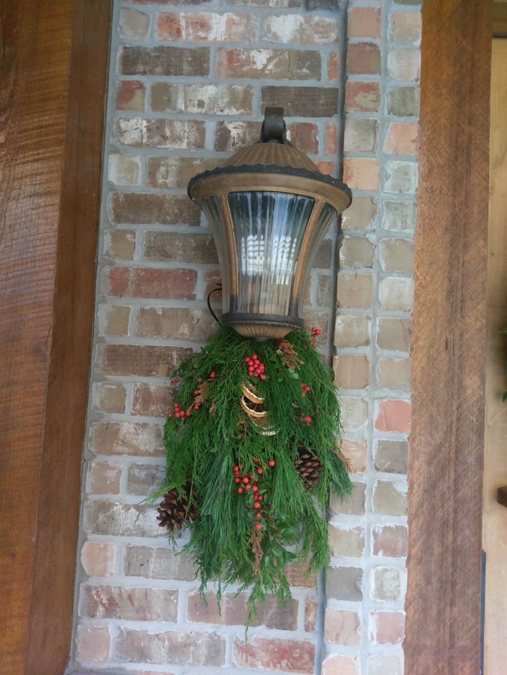 I filled in any gaps with small evergreen stems after adding the accessories. Then it was time to hang them up using wire to secure the swags.