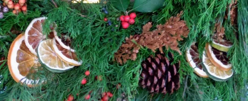 I also wired pine cones and holly berries, the dried fruits I dehydrated and various dried plant stems before hanging the up.