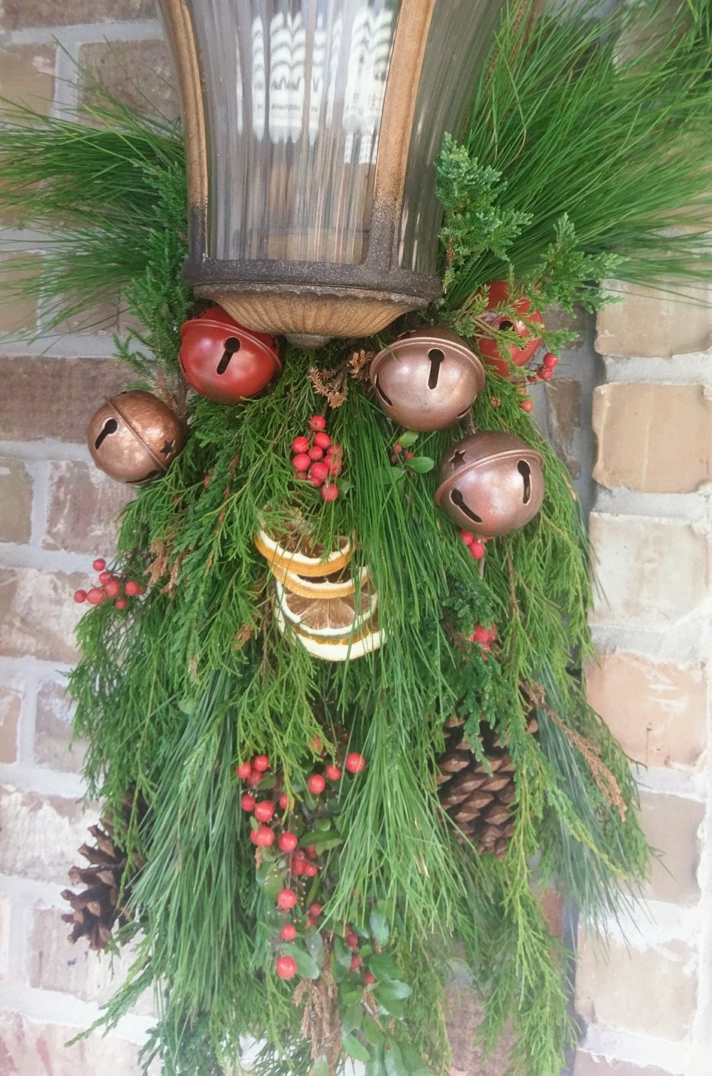 I added some evergreens and bells to the top of the swag and burlap and bells to the wreath.