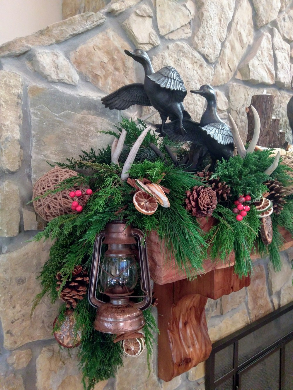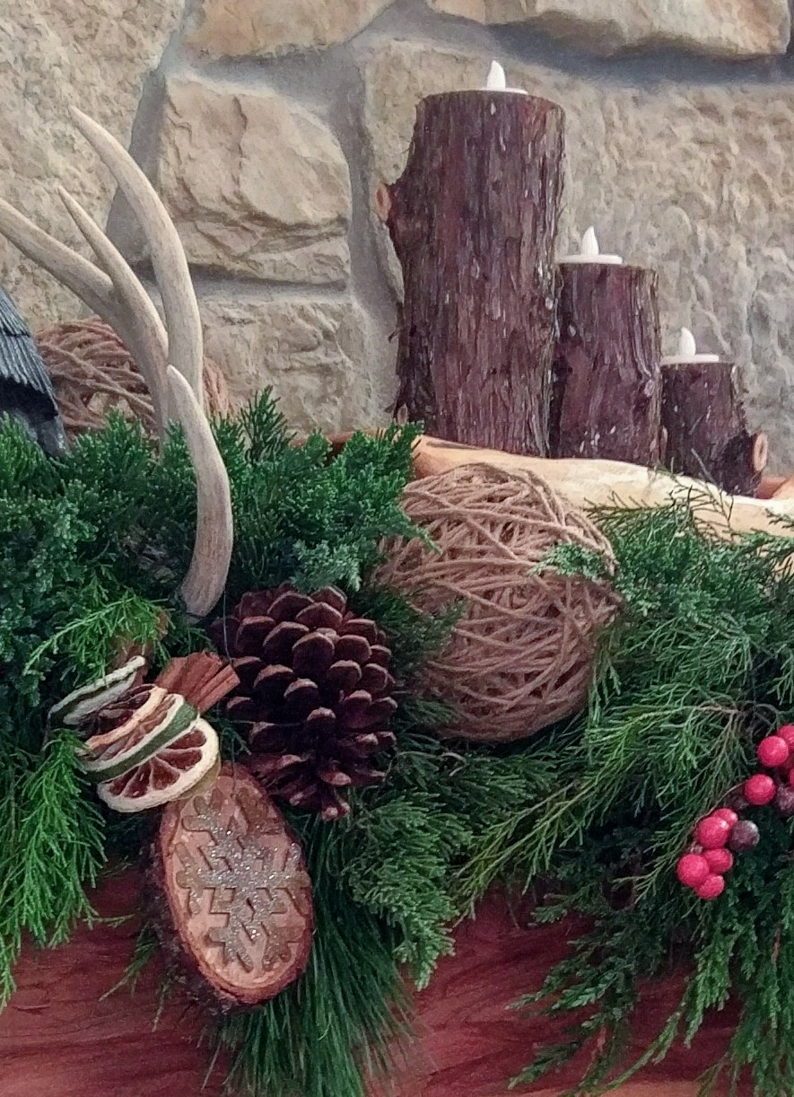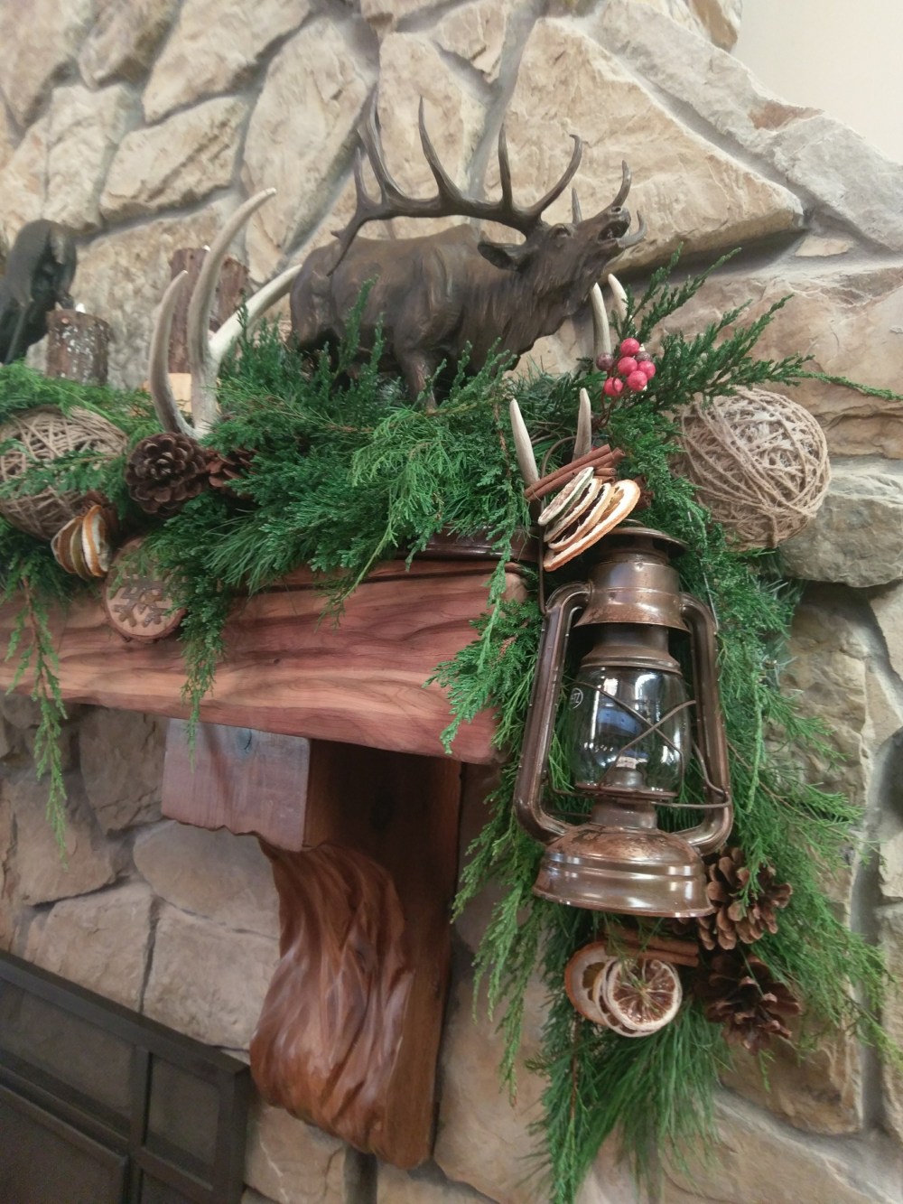 I started by clearing the mantel off completely. I made the short strips of evergreen garland about 3-4 feet long. I then secured each side to the mantel and used deer antlers on each end. I then added the center piece of garland and secured it took the left and right pieces of garland and to the mantel. I then added the decorations. I used the dried fruit and string ornaments and cedar candles and sliced wood ornaments I made. I also added bronze animals and rustic lanterns and pinecones and berries.
