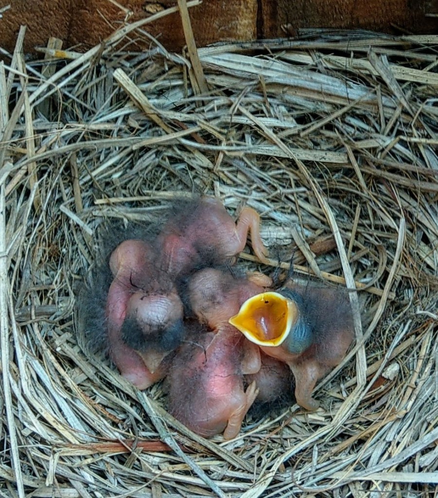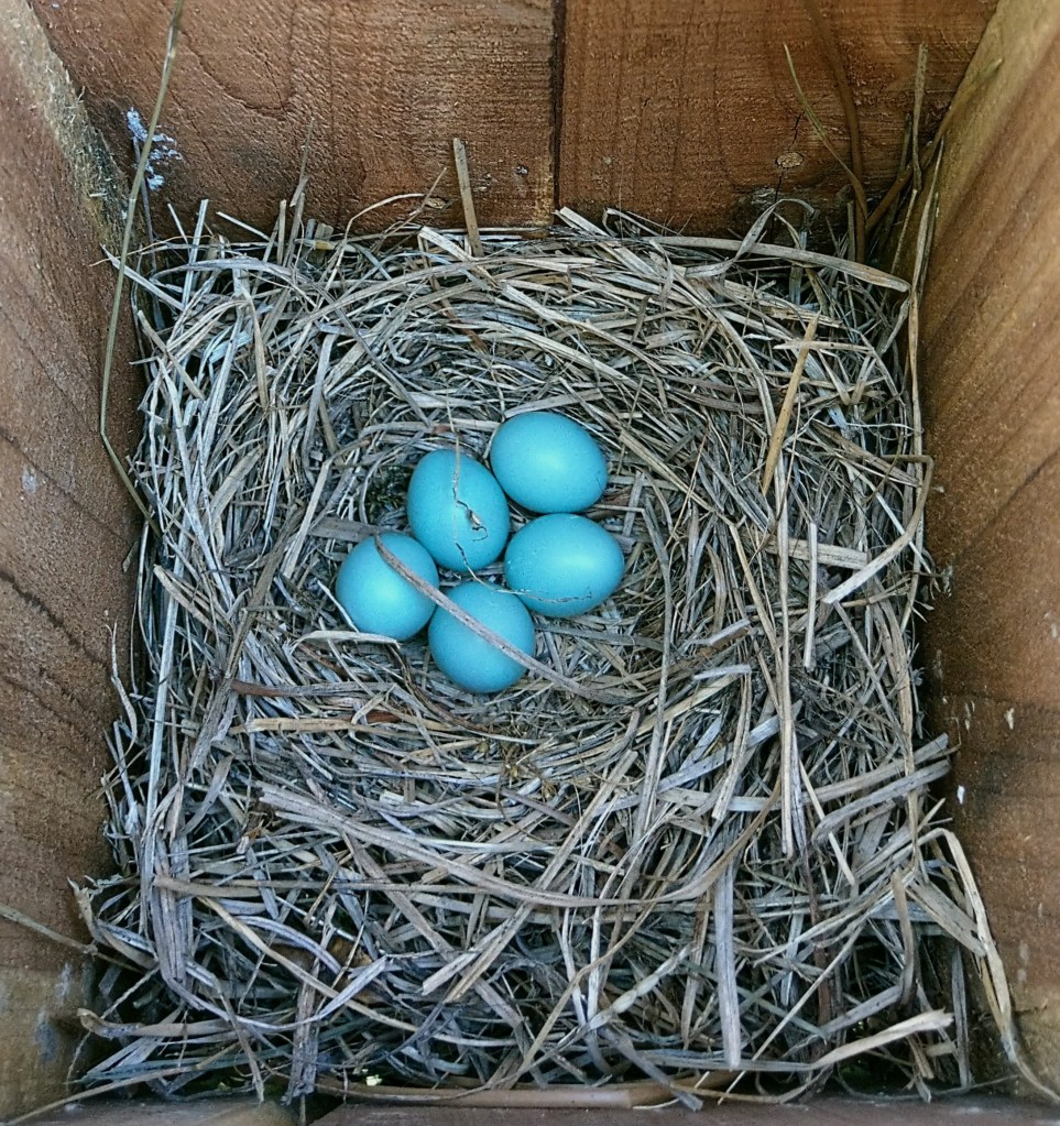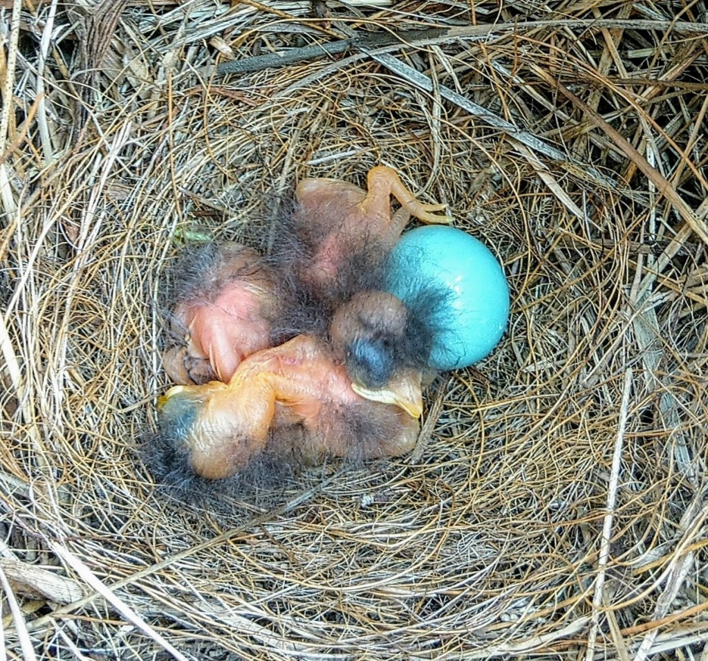 The eggs are a beautiful blue, and the hatchlings become so cute as they grow. Their chirps echo across the yard as the parents keep them fed.